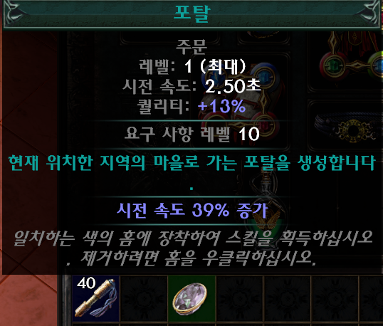 4. 포탈 젬은 사망시 시전 보조를 연결해서 쓰거나, 두번째 무기 슬롯에 장착된 주문 발동 옵션을 작업대에서 붙여 연결된 스킬을 쓰면 포탈이 발동되는 형식으로 딜레이 없이 사용할 수 있다.